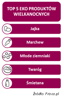 Jak wynika z analizy Frisco, przed ubiegłorocznymi świętami produktem, który pojawiał się w największej liczbie zamówień zawierających artykuły ekologiczne były bio jajka. Spośród warzyw najwięcej eko-koszyków zawierało marchew, młode ziemniaki, czosnek, buraki, włoszczyznę oraz cukinię. Klienci chętnie zamawiali też bio pomidory, ogórki czy kojarzącą się z Wielkanocą rzodkiew. W kategorii mięs królowały zaś szynka, wędzonka i kiełbasy. Osoby kupujące ekologiczny nabiał na świąteczny stół wybierały najczęściej twaróg, śmietanę i mleko.