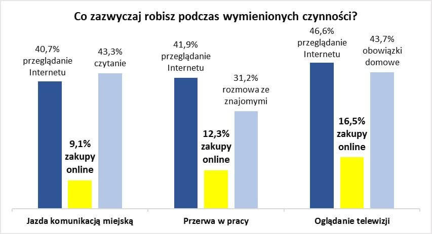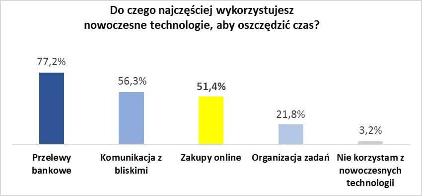 Smartfony, laptopy czy tablety stały się podstawowymi narzędziami pracy Polaków, a aplikacje mobilne nie służą już jedynie rozrywce. Nowoczesne rozwiązania usprawniają nasze życie oraz umożliwiają oszczędzić, takich jak np. sporo czasu przy wykonywaniu wielu obowiązków przelewy bankowe. Dla ponad połowy Polaków są one również pomocne przy codziennych kontaktach z bliskimi i znajomymi, choć jest to zdecydowanie domena kobiet (60% kobiet, 51% mężczyzn). Równie popularne, co korzystanie z mediów społecznościowych, stają się zakupy online – zamówienia przez Internet składa już ponad 57% kobiet i 43% mężczyzn. Coraz częstsze kupowanie przez Internet sprawia, że nawyk chodzenia na zakupy nie musi być już czynnością konieczną.